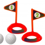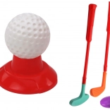 De tre forskellige køller med farverige hoveder giver variation i spillet og tilpasning til barnets færdigheder. Der medfølger også to huller og to flag for en realistisk golfoplevelse.