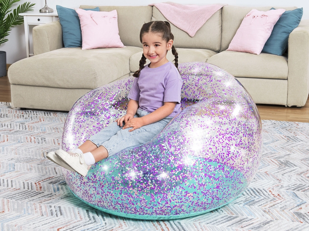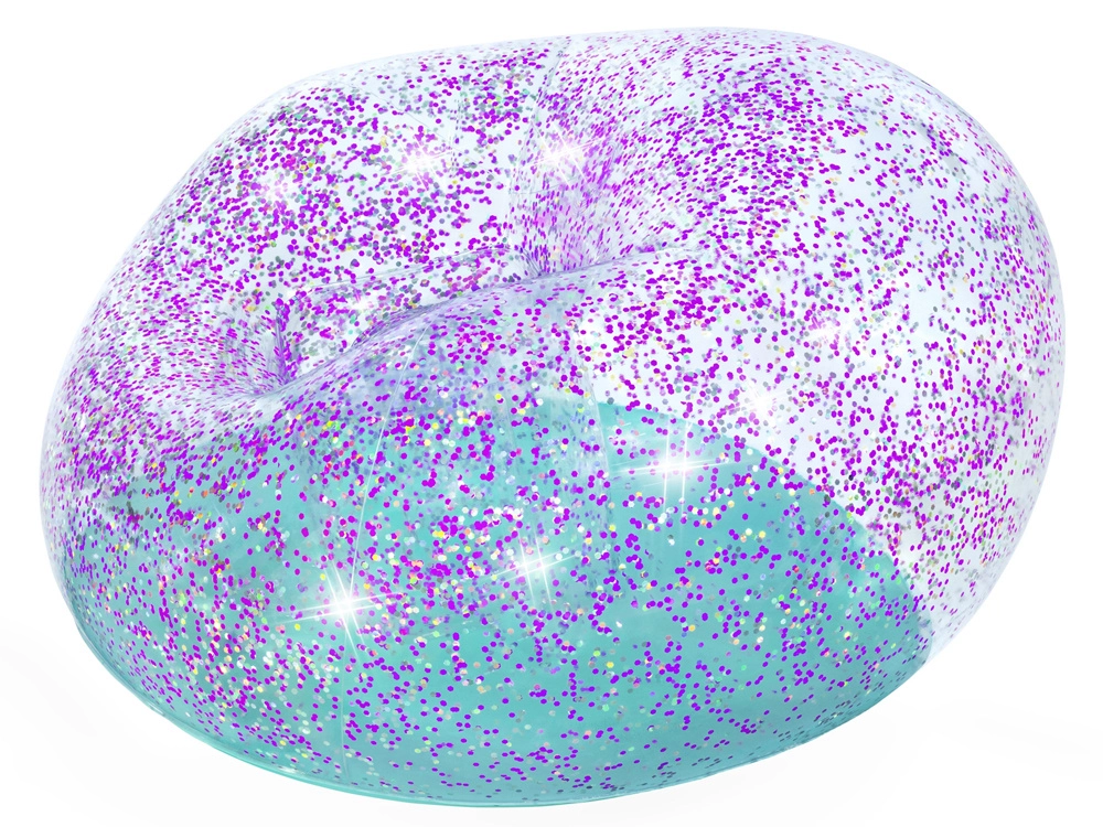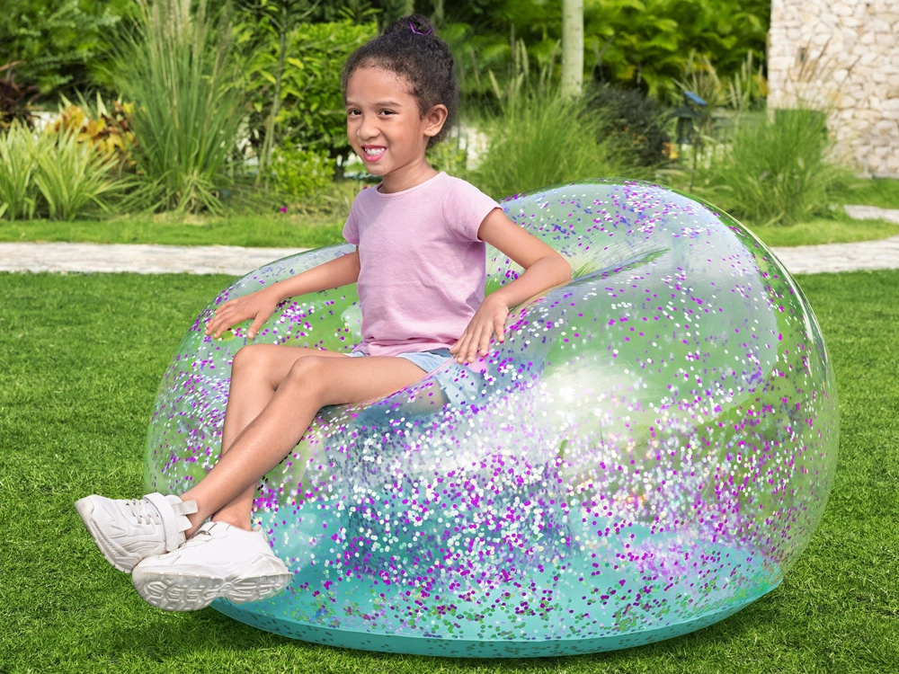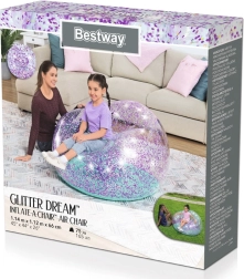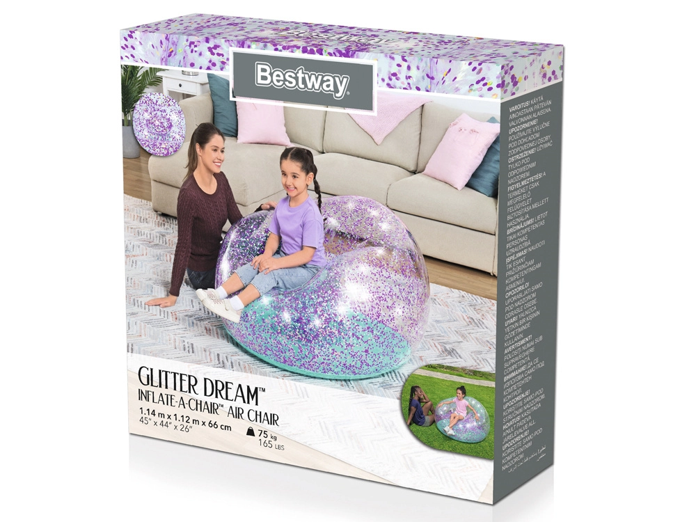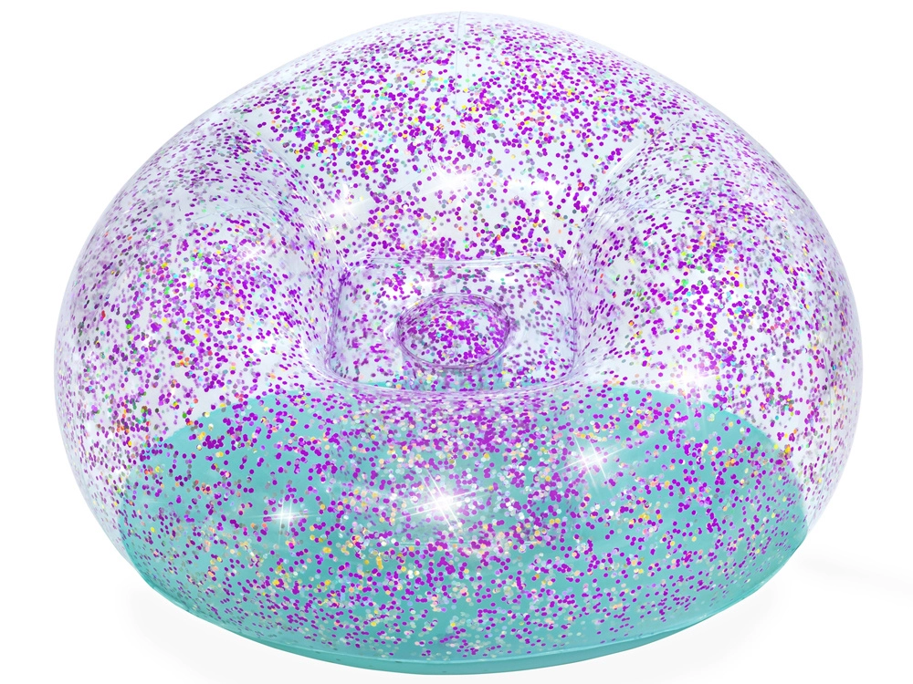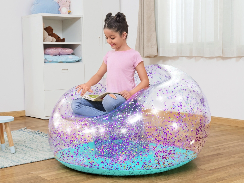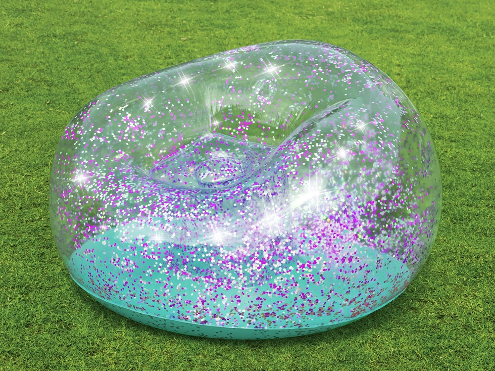 Den oppustelige brokade-lænestol Bestway Glitter Dream er et perfekt designelement til børneværelset eller som moderne havemøbel til unge. Lænestolen er lavet af gennemsigtigt PVC-materiale fyldt med glitrende brokade, hvilket giver den et kosmisk look, der lyser ethvert rum op.