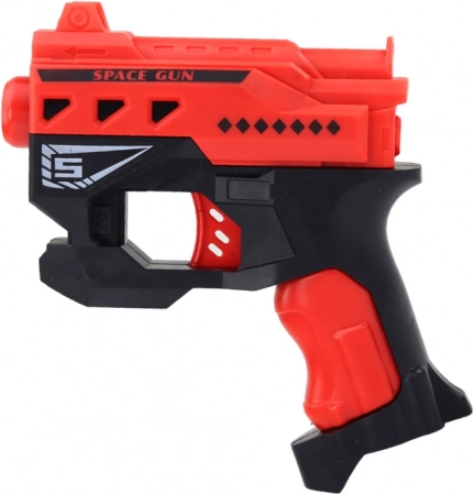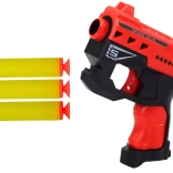 Sjovt og sikkert legetøj til børn: mini legetøjspistol til skumdartpile med sugekopper i en markant rød farve. Let konstruktion, nem betjening ved at trække op og trykke på aftrækkeren samt 3 pile med sugekopper til leg både inde og ude.
