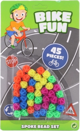Farverige dekorative perler til cykel. Materiale: plast. Pakken indeholder 45 perler. Efter montering bevæger de sig op og ned i takt med hjulenes bevægelse. Produktet er ikke legetøj