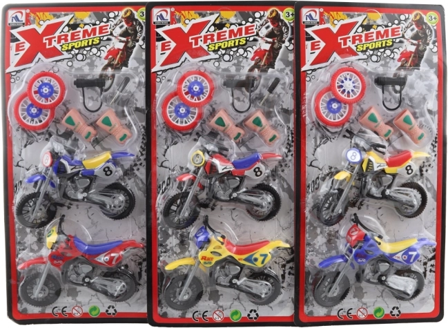 - Sæt med 2 motorcykler med udskiftelige hjul og skruetrækker