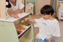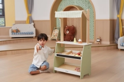 Træboden tilbyder rigelig plads til forskellige slags legetøj, hvilket gør den perfekt til leg som butik eller grøntsagsmarked.