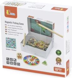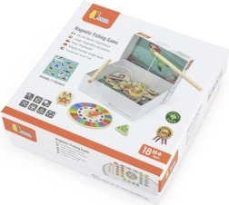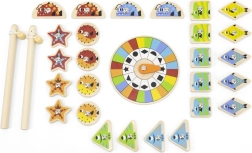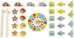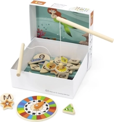 Dette magnetiske fiskespil i træ gør læring til leg. Børn fanger farverige fisk med magnet ved hjælp af to stænger og vælger korrekt farve eller form efter drejhjulet. På bagsiden af hver fisk er der et bogstav i alfabetet, så de også øver de første skridt i før-læsefærdigheder under legen.