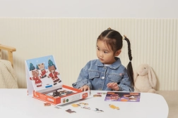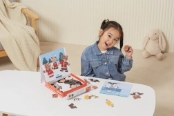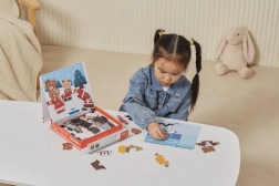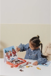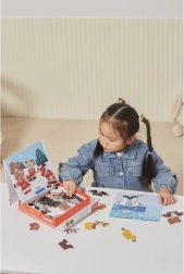 Dette kreative sæt bringer den populære træmagnetiske påklædning med motiv af en bjørnefamilie. Børn kan sammensætte forskellige outfits og udtryk, afprøve professioner og hverdagssituationer og skabe deres egne historier. 54 magnetiske dele giver masser af kombinationer til mange timers leg.