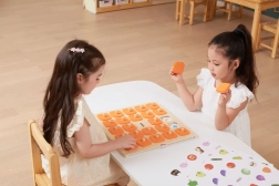 En massiv træplade med 25 kvadratiske felter og orange dæksler med greb er holdbar og nem for små børnehænder at håndtere.
