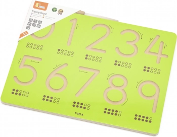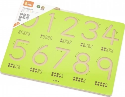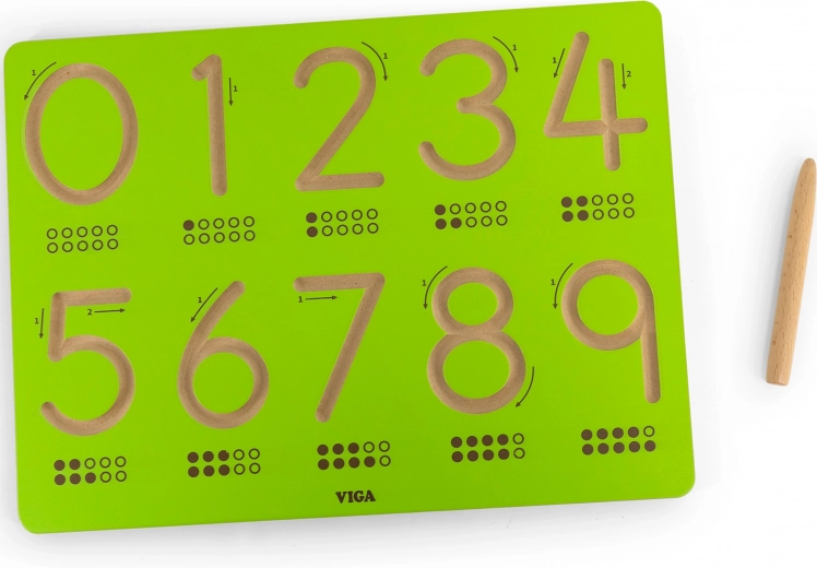 Denne kvalitets trætavle med fræsede tal 0–9 er et ideelt redskab til de første skridt mod skrivning. Barnet følger buede riller med retningspile med en træpen og forankrer derved korrekt form på tallene, rytme og hukommelsesspor for en glattere overgang til at skrive med blyant.