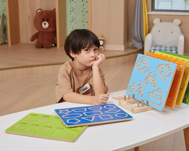 Denne kvalitets-trætavle med udskårne former guider barnet naturligt til flydende strøg og korrekt bevægelsesretning. Ved gentagen omridsning af formerne styrker børn deres grafomotoriske færdigheder, som er afgørende for fremtidig skrivning og tegning.