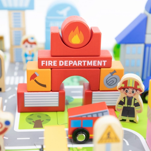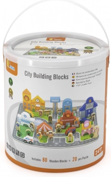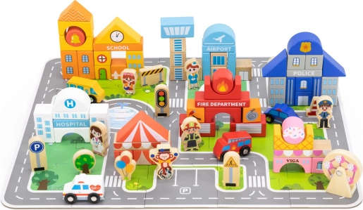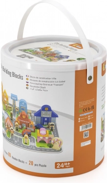 Dette kvalitetsbyggesæt i træ giver børn en komplet by på én spilleflade. Med 20 puslespilsdele lægger de først veje og pladser og bygger derefter bygninger af 60 farvede klodser. Der medfølger køretøjer, figurer i forskellige erhverv samt tilbehør som træer og vejskilte for en endnu mere realistisk leg.
