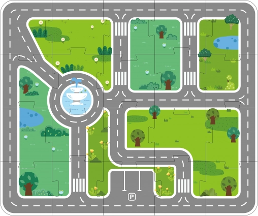 - Komplet by på puslespilsunderlag med veje og rundkørsel