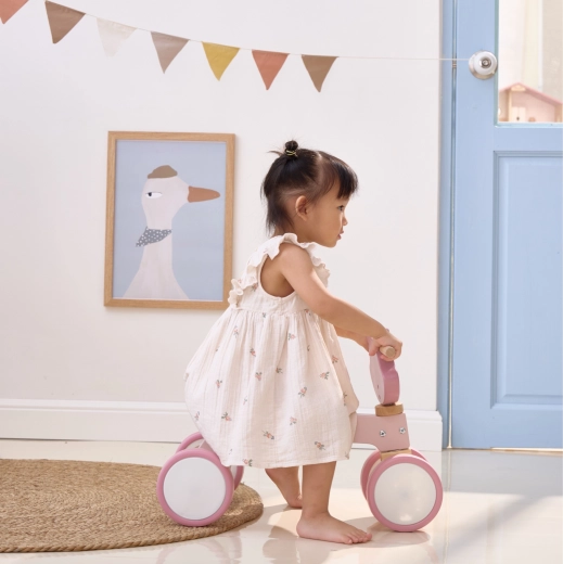 Solidt træ, glatte og afrundede kanter samt ugiftige farver gør løbecyklen til et holdbart og sikkert valg til de første ture.