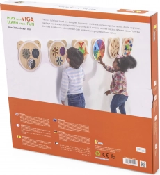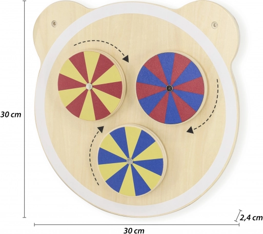 Træpanelet med det søde bjørnehoved forvandler ethvert børnehjørne til et kreativt legeområde. De tre farvede hjul kan let drejes og giver imponerende optiske effekter, som fanger børns opmærksomhed og motiverer til videre udforskning. Panelet er ideelt til børneværelser, børnehaver og legerum.