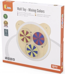 Tre letroterende hjul i grundfarver danner fængende mønstre, når de drejes. Børn lærer at genkende farver og opfatter bevægelse og rytme på en legende måde.