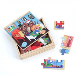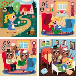 Fire separate puslespil med 9 brikker fortæller eventyret om Guldlok trin for trin og støtter både fantasi og fortælleevne.