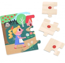 Sættet indeholder 4 illustrerede billeder fra eventyret om Guldlok, hver sammensat af 9 robuste brikker. Børn træner koncentration, hukommelse og tålmodighed, samtidig med at de nyder de smukke, farverige illustrationer med retropræg af Ingela P. Arrhenius. Takket være træmaterialet er puslespillene holdbare og velegnede til små børnehænder.