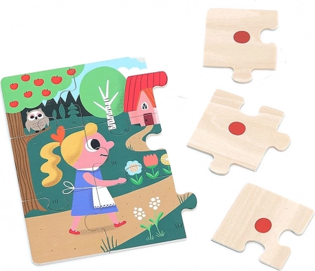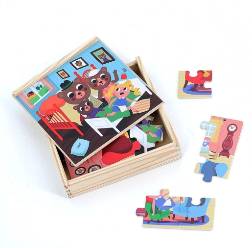 Oplev et magisk sæt med fire træpuslespil med motiv fra eventyret om Guldlok. Hvert puslespil har 9 brikker og er opbevaret i en praktisk trææske med bomuldshank. Udvikler finmotorik, logisk tænkning og sammenhængende fortælling. Farvede prikker på bagsiden af brikkerne gør sorteringen lettere, og de smukke illustrationer af Ingela P. Arrhenius fanger børnenes opmærksomhed med det samme.