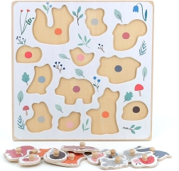 Oplev VILACs træpuslespil med knopper med motiv af skovdyr, som på legende vis udvikler finmotorik, øje–hånd-koordination og genkendelse af former og farver. Takket være 12 brikker med træknopper og farvede hjælpepunkter lærer børn fra 18 måneder let gennem leg.