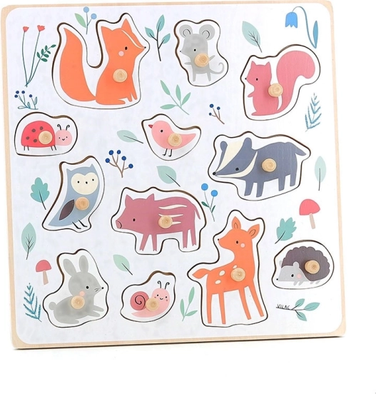 Ræv, mus, egern, mariehøne, lille fugl, grævling, ugle, gris, hare, snegl, rådyr og pindsvin – ideelt til at udvide ordforråd og lære former og farver at kende.