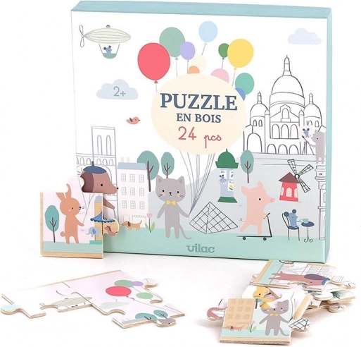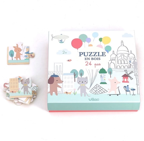 Panoramisk træpuslespil Vilac Paris fra 2 år. 24 brikker, design af Sarah Betz. Udvikler finmotorik og koncentration. Kvalitetsprodukt, holdbart, Montessori.