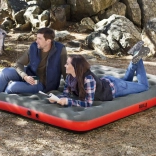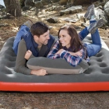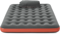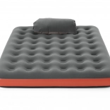 Denne dobbelte oppustelige madras kombinerer robust PVC, der er modstandsdygtigt over for skader, med en behagelig fløjsagtig (flokket) overflade for højere komfort og bedre greb til lagenet. Den integrerede 2-i-1-pude og den stabile coil‑beam konstruktion giver jævn kropsstøtte hele natten.