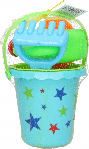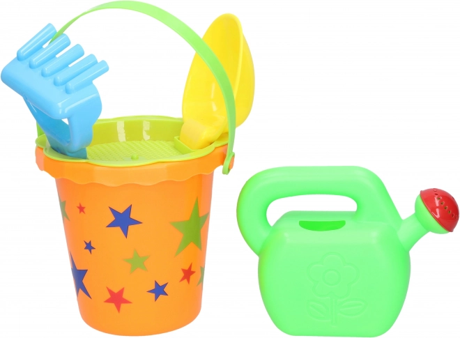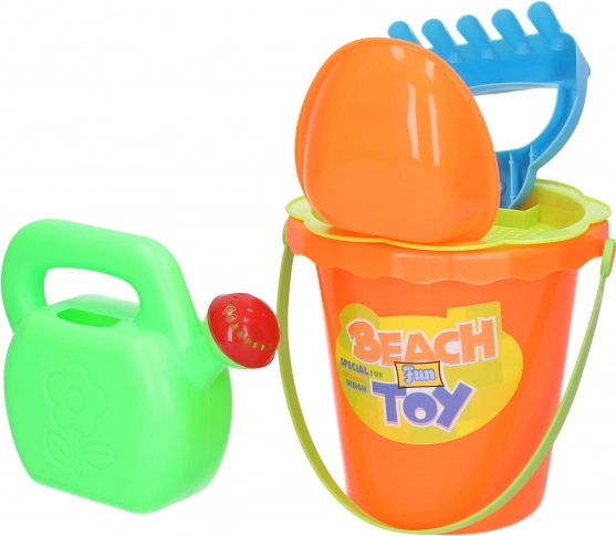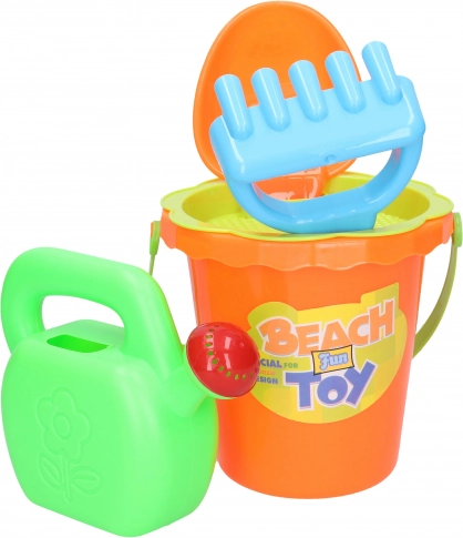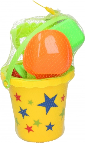 Praktisk sandsæt til børn i størrelsen 15 cm indeholder alt, hvad små byggere har brug for: spand, si, vandkande, rive og skovl. Findes i 2 farvevarianter – gul og orange. Perfekt til legeplads, strand og have.