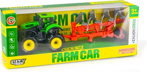 Traktor med plov og inerti. Attraktivt legetøj i to farver, 25 cm lang, for timer med sjov på gården.