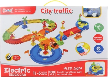 Denne bane med bil er lavet af kvalitetsplastik og er designet til børn fra 18 måneder. Når der indsættes 1 AA-batteri (medfølger ikke), vil den lille bil lyse op og begynde at køre på banen. Sættet indeholder i alt 108 dele, som giver mulighed for at bygge forskellige former og spor, som børnene kan udforske. På grund af sin størrelse er banen let at transportere og kan nemt opbevares eller tages frem efter behov.