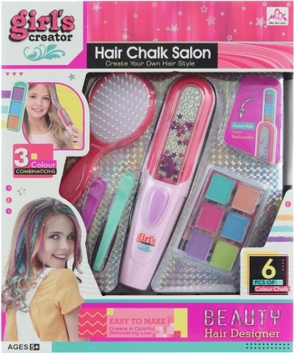 Sæt til små frisører. Pakken indeholder hårkridt, applikator, hårbørste og to hårklemmer. Pakket i æske. Emballagens mål ca. 26×31×6 cm. Alder 5+