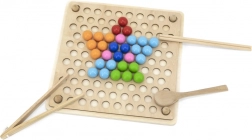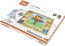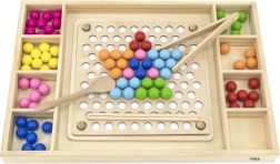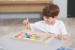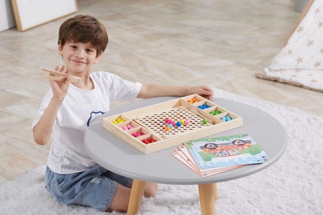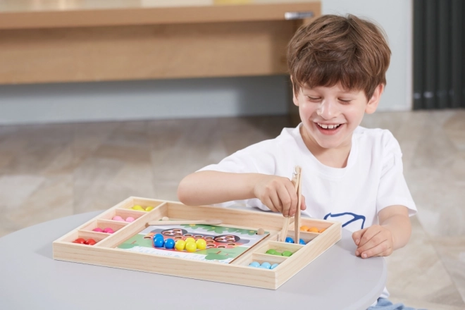 Det træbaserede læringsspil "Fang og Sortér" lader børn afprøve forskellige mønstre og farver efter de medfølgende kort eller deres egen fantasi. Med dette spil kan børn fastgøre et papir på den træbakke og ved hjælp af pinde, ske eller klemme lægge farvede kugler i hullerne på pladen. Til sidst kan børnene skabe smukke billeder.