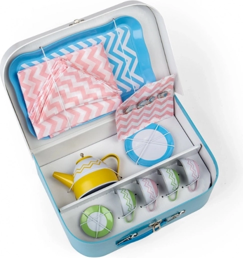 Dette metal-tesæt til børn fra BIGJIGS TOYS er opbevaret i en solid papkuffert, så børnene kan tage det med overalt. Den robuste konstruktion i metal sikrer lang levetid og sikker leg.