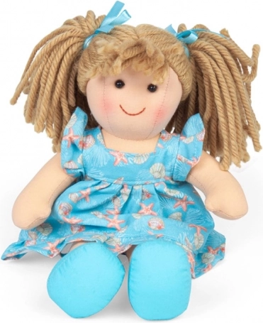Stofdukken Maisie er designet med fokus på sikkerhed, komfort og lang holdbarhed. Takket være den bløde tekstilkrop er den perfekt til kram og til daglig leg. Det glade smil og den blå kjole med havmotiver bliver straks et hit hos børnene.