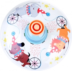 Spillefladen er dekoreret med legende dyreillustrationer med cirkustema, der styrker fantasi og visuelt fokus. Metalkroppen kombineret med et plastgreb sikrer holdbarhed selv ved daglig brug. Toppen er ideel til udvikling af finmotorik, hånd–øje-koordination og tålmodighed.