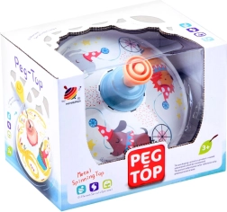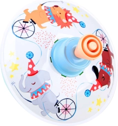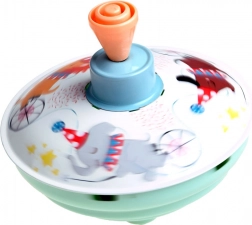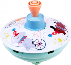 Traditionel metalsnurretop med søde dyremotiver glæder både små og store. Den er let at betjene ved at trykke på stemplet, snurrer jævnt og udsender en blid, karakteristisk lyd, som fanger børns opmærksomhed. Det robuste metal og pastelfarver med cirkusmotiv gør den til en tidløs legetøjsklassiker, der udvikler finmotorik og koncentration.