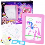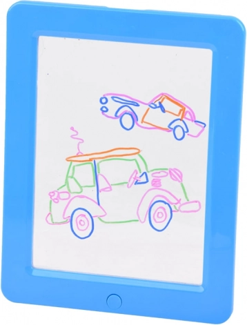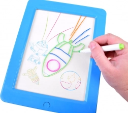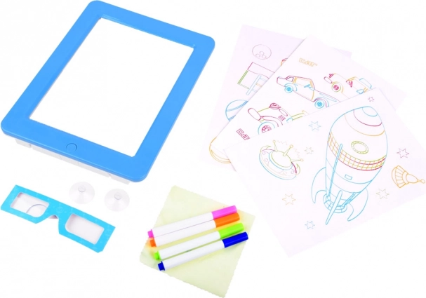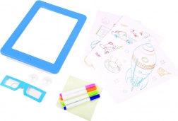 Den lysende tavle er et fantastisk redskab til at udvikle fantasi, kreativitet og finmotorik. Børn kan tegne egne motiver eller nemt tegne efter skabelonerne fra de medfølgende kort og derefter sætte dem i rammen med LED-belysning. Med 3D-brillerne på får deres værker en rumlig effekt, der begejstrer.
