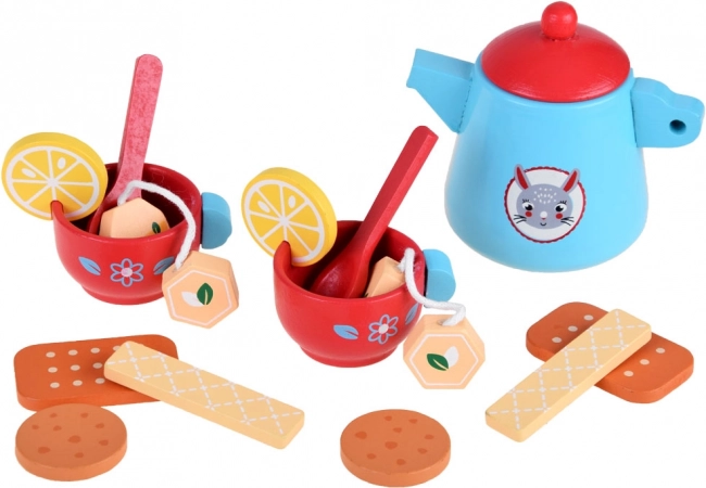 Dette elegante tesæt i massivt træ vil begejstre alle små værter og værtinder. De blide blå og røde farver, de søde motiver og det rige tilbehør fremmer kreativ leg, sociale kompetencer og sansemotorik. Børn kan servere te med citron, byde på småkager og øve bordskik.