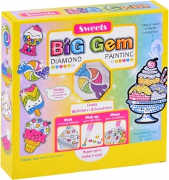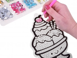 Skab strålende billeder og klistermærker med slikmotiver ved hjælp af større “diamanter”, som nemt opsamles med applikatoren og placeres præcist på de selvklæbende skabeloner. Børn øver hånd–øje-koordination, koncentration og æstetisk sans på en legende måde – og resultatet bliver smukke dekorationer til vindue, spejl, hæfte eller hylde.