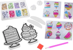 Lav glitrende klistermærker og hængende pynt (fx til vinduet) takket være 2 store skabeloner, sugekopper med kroge og 12 sjove dessertmotiver.