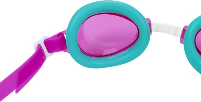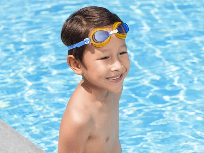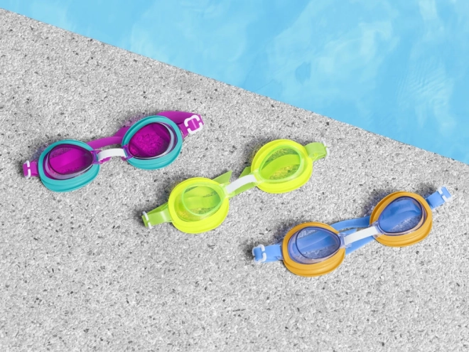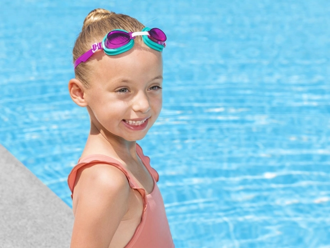 Børnesvømmebriller BESTWAY Aqua Burst Essential 3+: komforttætning, UV-beskyttelse, bredt synsfelt og silikonerem for sikker indlæring af svømning.