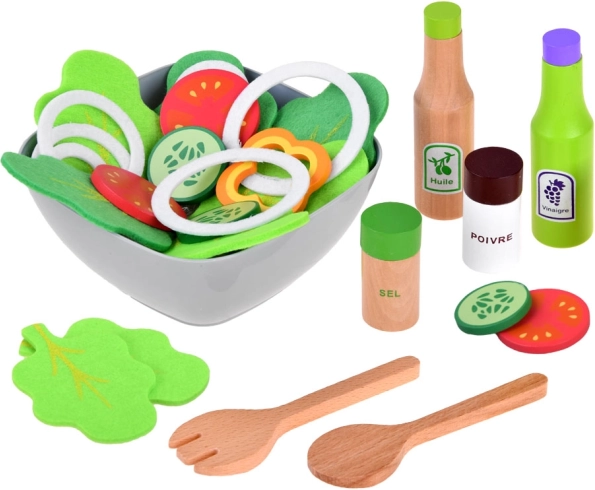 Støt børns fantasi og sunde vaner med et salatsæt. Indeholder sikre dele af træ og filt, skål og redskaber til realistisk leg. Børn træner finmotorik, lærer at kende grøntsager og nyder kreativ madlavning uden rod. Sikre materialer, klare farver og dele til at blande og servere gør det til et ideelt tilbehør til ethvert legekøkken.