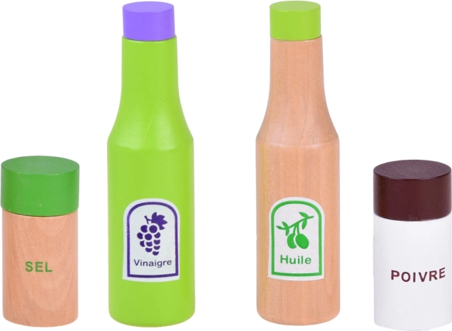 Tekstilskiver af grøntsager, krydderibeholder i træ og serveringsske giver børn mulighed for at lave en “ægte” salat og udvikle fantasien i køkkenlegen.
