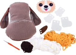 Oplev et sjovt DIY-sæt, hvor børn selv laver en sød pude formet som en hund. Der er ikke brug for nål eller syning til gennemtræk – alt klares nemt og sikkert med den medfølgende hæklenål. Filtdelene (poter, snude, hale og små sko) fastgøres enkelt ved at trække garnet gennem de forberedte huller.