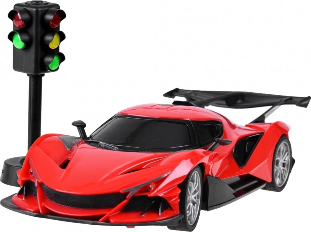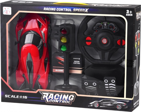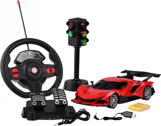 Oplev realistisk ræs med en RC-sportsbil med sæt: rat + pedaler og trafiklys. Takket være intuitiv styring har du fuld kontrol over kørsel frem/tilbage og styring. Bilen har lyseffekter, gummidæk for bedre vejgreb og drives af et genopladeligt batteri.