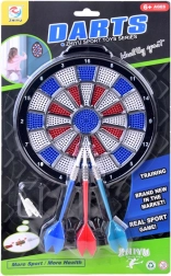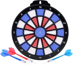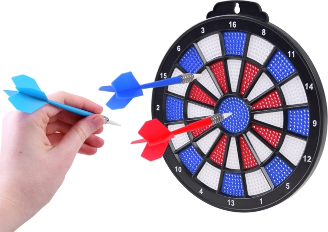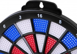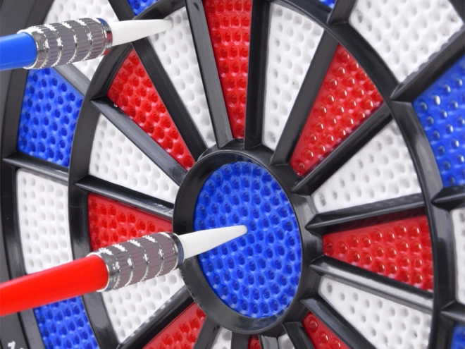 Dartskiven er designet til fritidsbrug med røde, blå og hvide segmenter for præcis målretning og scoring.