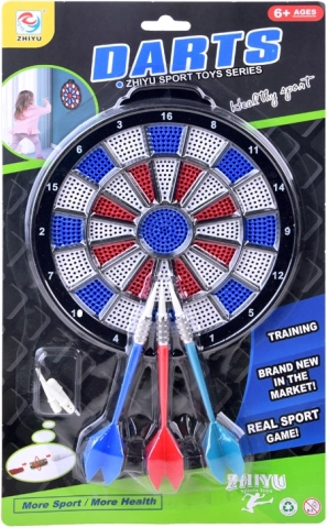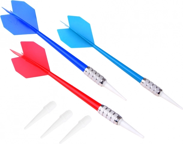 Sættet indeholder tre dartpile med metalhåndtag og hvide plastspidser, ideel til sikker indendørs leg.
