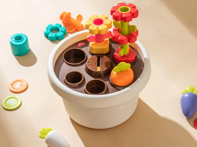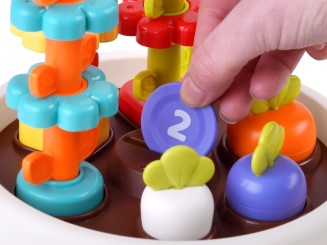 Legetøjet fremmer barnets finmotoriske færdigheder gennem interaktive elementer som stabelbare blomster og farverige markører.