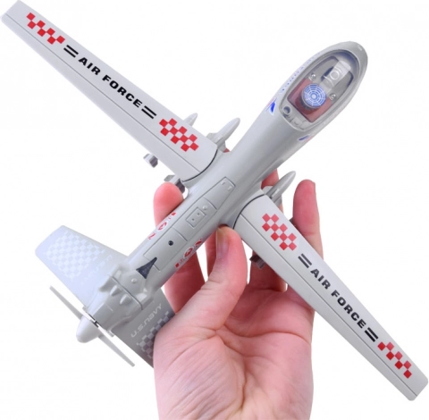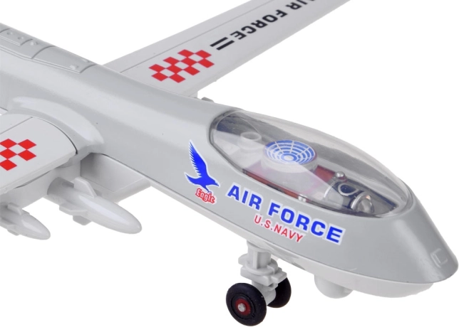 Den metalliske dronemodel tilbyder ikke kun præcise detaljer, men også foldbare vinger og en roterende rotor, hvilket gør den til ideel underholdning for både børn og voksne. Dronen er udstyret med pull back-funktion, som gør, at den kører fremad efter at være trukket tilbage. Denne egenskab sammen med lyd- og lyseffekterne giver en fornemmelse af ægte luftaktion.