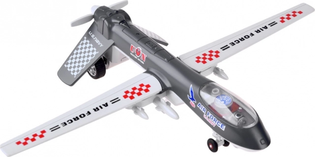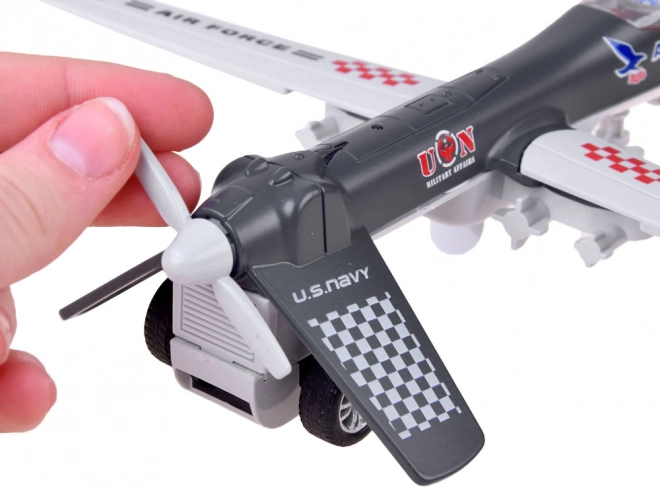 Modellen af militærdrone er et fremragende legetøj for alle, der interesserer sig for militærteknologi. Fremstillet af metal og plast, leveres denne drone i neutrale camouflagefarver og er udstyret med foldbare vinger og en bevægelig propel. En nøglefunktion er pull-back-fremdrift – træk blot legetøjet tilbage og slip for at få det til at køre fremad. Når dronen får fart, aktiveres også propellen, som begynder at rotere.
