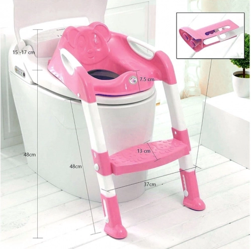 Dette lyserøde toiletsæde med panda motiv er designet til at lette dit barns overgang fra potte til almindeligt toilet. Egenskaber: