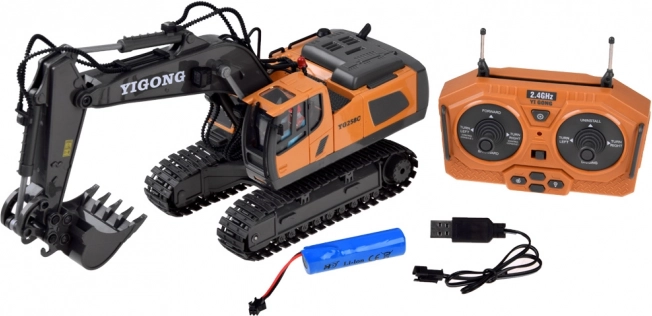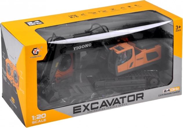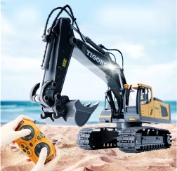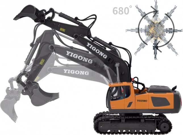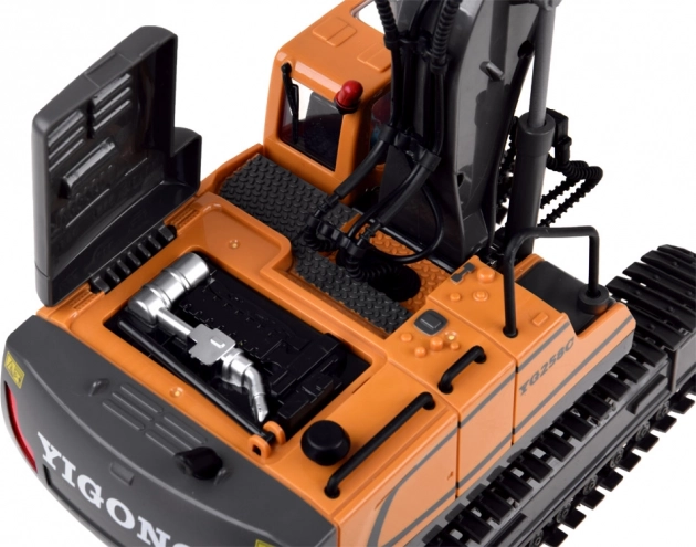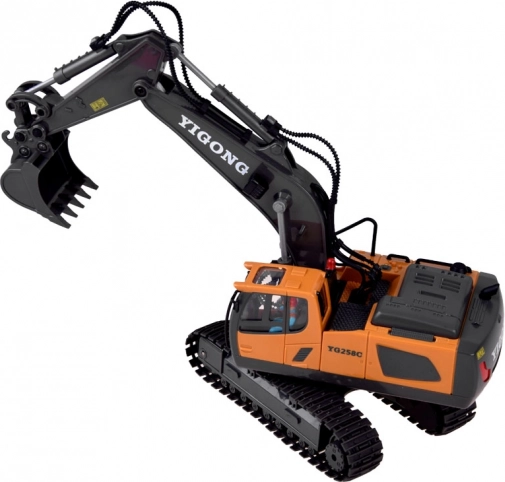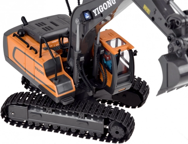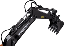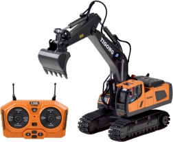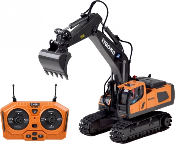 Den ergonomiske 2,4 GHz-controller sikrer stabil rækkevidde uden forstyrrelser og muliggør kørsel frem/tilbage, drejning højre/venstre, rotation på stedet samt fuld styring af arm og skovl. Der er også en demotilstand. Graveren har åbningsbart motordæksel og kvalitetsbygget konstruktion for lang levetid.