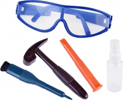 Mejsel, hammer, pensel, forstøver og beskyttelsesbriller – komplet udstyr til små opdagere, som understøtter finmotorik og koordination.