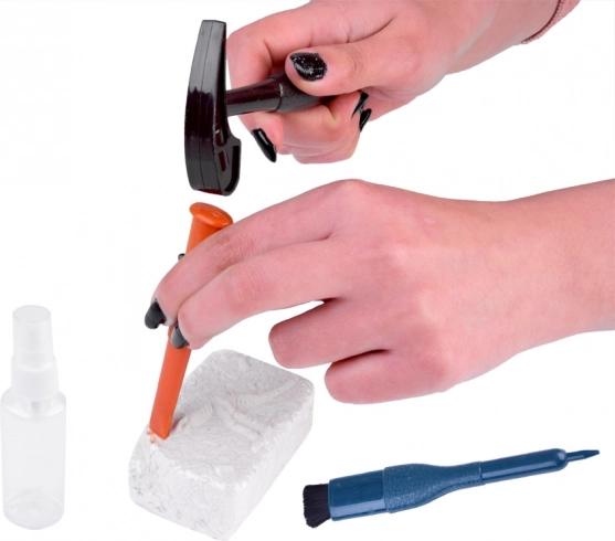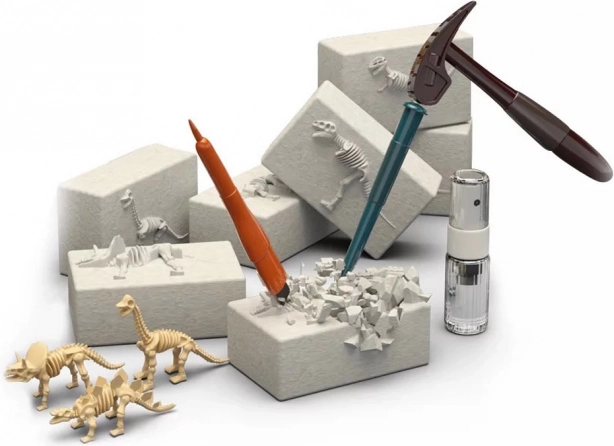 Sættet er ideelt som en kreativ og lærerig gave til nysgerrige børn. Fremgangsmåden er enkel: fugt, afdæk forsigtigt med mejsel og hammer, børst støvet væk med penslen, og saml til sidst skelettet. Resultatet er en lille hjemmesamling af seks dinosaurmodeller.